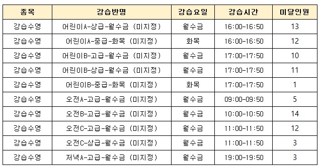 수영 강습반 중 신청 미달 프로그램 대상 추가모집